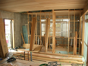 ④古い壁や柱を取り除き、新規に部屋の枠組みを行います。